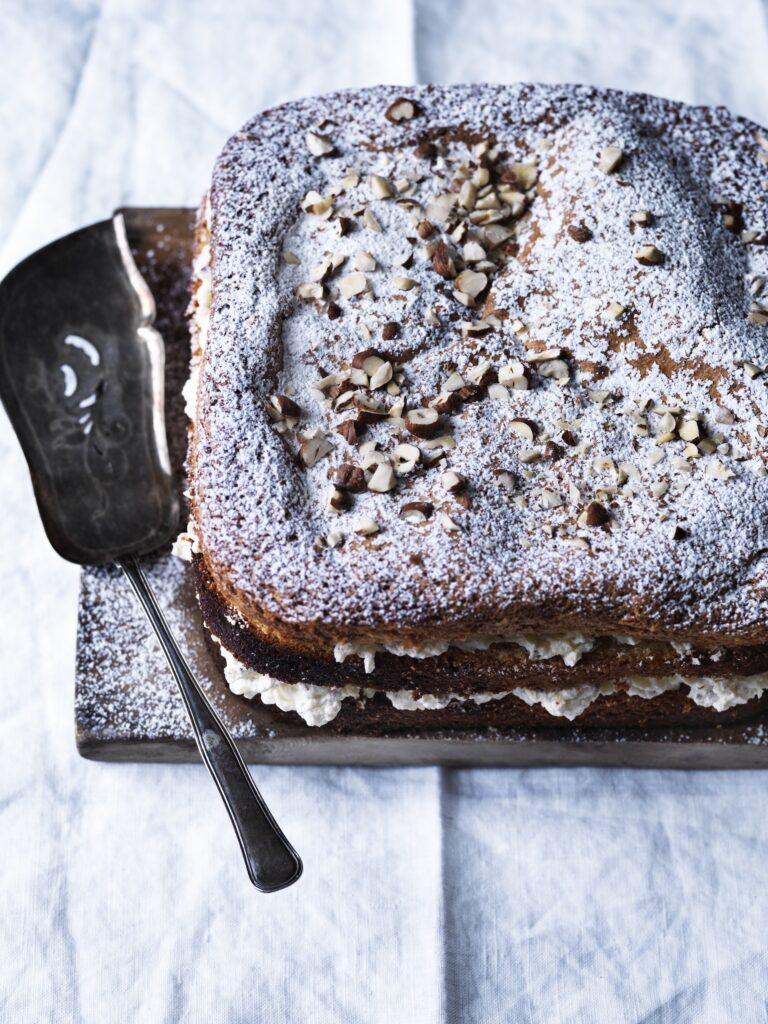 Sprinkle with half the calvados. Spread one-half of the cream evenly over and place on the middle layer. Sprinkle with the remaining calvados. Spread over the rest of cream, then place on the top layer and dust with icing sugar and hazelnuts.