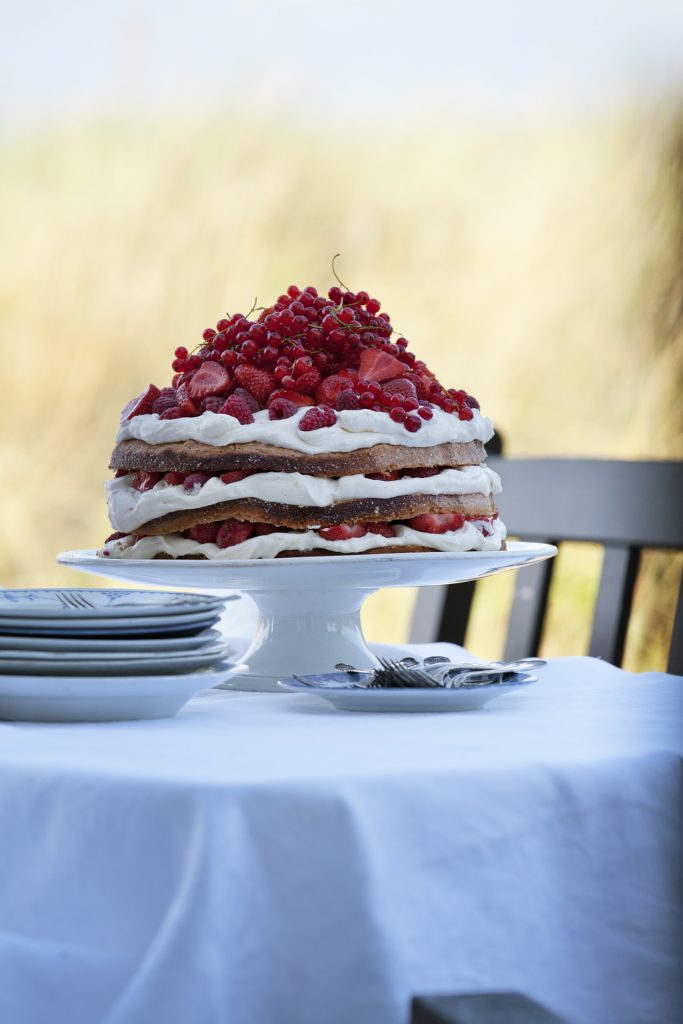 Take a big round serving dish for the layer cake and place the first layer of the sponge cake, spread out 1/3 of the cream and then 1/3 of berries. Then another layer of the sponge cake, cream again, berries and then the last layer of the sponge cake. Spread the last of the cream and decorate with the rest of berries and the red currant still on stalk.
